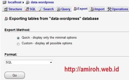 3. Pilih menu Export, Berilah pilihan pada Export Method (Quick – Display only minimal option) dan Format (pilih SQL)